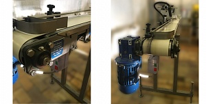 Транспортер представляет собой раму, состоящую из двух частей на которой установлены: настилы, поддерживающие ролики, барабаны натяжной и приводной и натяжное устройство. Высота транспортера регулируется.