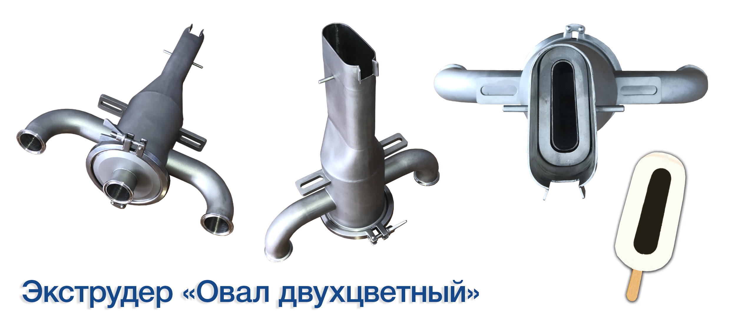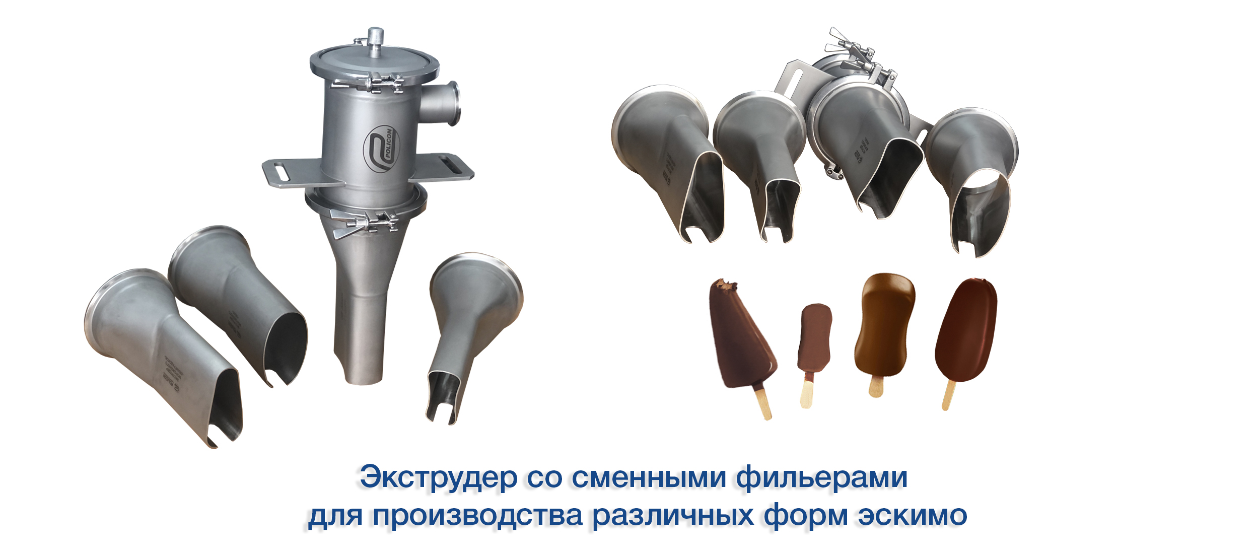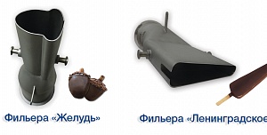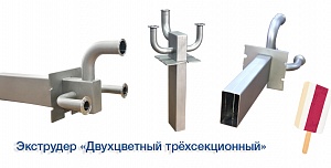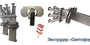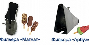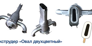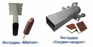 Экструдеры и фильеры различной формы и сложности для производства мороженого: "Сэндвич", "ОЕ", "Желудь", "Магнат", "Овал", "Ленинградское", "Футбол", "Светофор", "Арбуз".