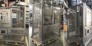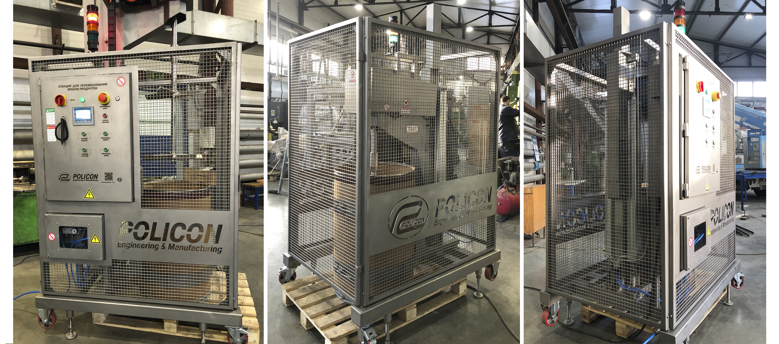 Станция состоит из сварного каркаса на четырёх опорах каретки, мешалки с приводом подъёма и опускания, держателя захватами ёмкости, шкафом управления с HMI панелью оператора, защитным ограждением.